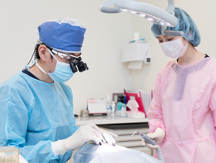 インプラントは入れて終わりではありません。当院では定期メンテナンスで、口腔内の清掃・消毒・バイオフィルム除去を行い、良い状態を保つサポートをします。