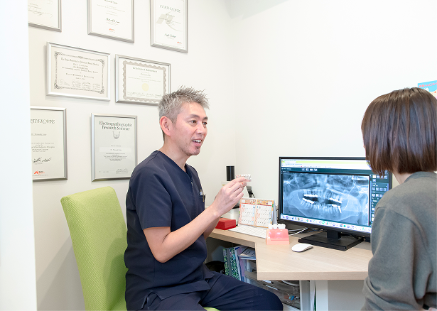 不安の多い治療だからこそ、当院は説明を重視しています。メリットだけでなく、デメリット・リスク・代替治療(入れ歯/ブリッジ等)まで含めて比較し、納得できる選択をサポートします。